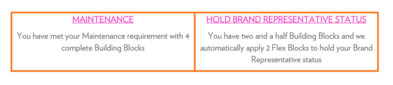 We apply Flex Blocks to hold your Brand Representative status, if you have at least one completed Building Block. In any month that you have not met Maintenance, we will automatically apply up to 3 Flex Blocks in place of missing Building Blocks (to the extent you have sufficient Flex Bocks available), to hold your status as a Brand Representative. An entire Flex Block is applied in place of an incomplete Building Block regardless of how much Sales Volume is needed to complete the Building Block. You can check your Volumes & Genealogy to see how many Flex Blocks you have available.