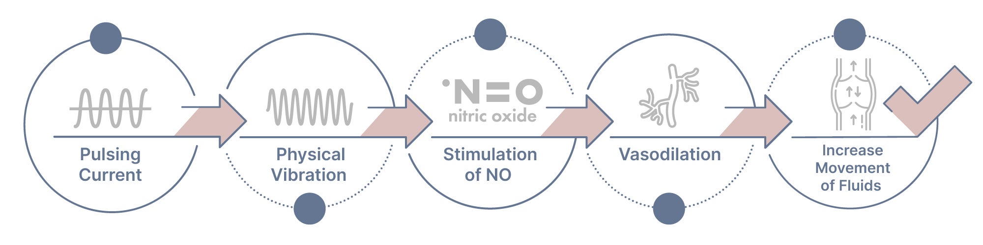 Pulsing current can generate physical vibrations through the skin to stimulate nitric oxide for increasing vasodilation and driving microcirculation.