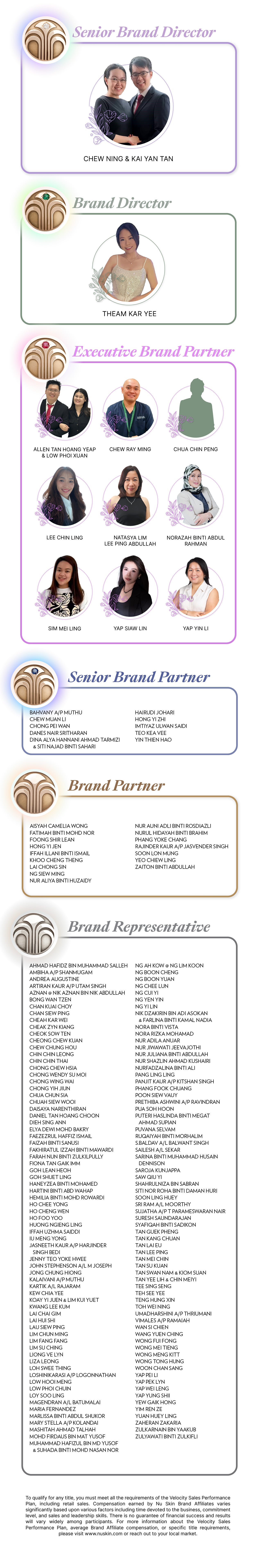 Generating sales compensation as a Brand Affiliate requires considerable time, effort and dedication. Success will also depend upon your skills, talents and leadership abilities. There is no guarantee of financial success and results will vary widely among participants. For more information regarding the Velocity by Nu SkinĀ® Sales Performance Plan, please contact the Nu Skin office in your home market or go to www.nuskin.com.